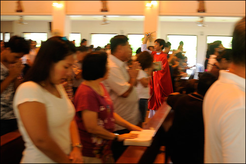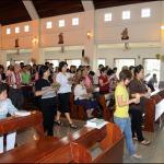 วัดเป็นสถานที่ศักดิ์สิทธิ์เป็นที่ประทับของพระเป็นเจ้า เพราะมีพระแท่นบูชา และศีลมหาสนิท ซึ่งหมายถึงการประทับอยู่ของพระเยซูคริสตเจ้าในสถานที่นั้น เพราะฉะนั้นการเข้าไปในวัดจะต้องมีความเคารพ และสำรวมด้วยท่าที และการแสดงออกทุกอย่าง พ่อดีใจครับที่วัดของเรามีการติดประกาศเตือนให้สำนึกว่า “ต้องแต่งกายให้เรียบร้อย และให้ปิดเครื่องมือสื่อสาร” เรื่องโทรศัพท์มือถือก็มีเสียงดังขึ้นมาบ้าง แต่นานๆ ครั้งก็ถือว่าเป็นความเผลอเลอลืมปิดไปไม่ว่ากัน บางทีพ่อก็ยังลืมเหมือนกัน ส่วนเรื่องการแต่งกายส่วนใหญ่ก็แต่งกายเรียบร้อยพอสมควรอยู่แล้ว แต่ก็มีบางส่วนควรปรับปรุงตัวให้เข้ากับกาลเทศะเหมือนกัน พี่น้องต้องสอนลูกหลาน และเป็นแบบอย่างให้กับพวกเขาในเรื่องนี้ด้วย เหมือนกับสมัยปู่ยาตายายของเรา พวกท่านจะจัดหาชุดพิเศษไว้แต่งมาวัดกันเลยทีเดียว นี่เป็นเรื่องดีนะครับควรเก็บรักษาไว้และปฏิบัติกันต่อไป สำหรับคุณพ่อคุณแม่ควรระวังเป็นพิเศษ เพราะในสายตาของเราลูกๆ ของเราจะดูเป็นเด็กตลอดกาล แต่ความจริงพวกเขาโตแล้ว และโตเร็วกว่าสมัยของเราด้วย เราต้องสอนให้พวกเขาแต่งตัวมาวัดอย่างเหมาะสม อาทิ การสวมกางเกงขาสันเต่อมาวัด เพราะเขาโตแล้วไม่ใช่เด็กเล็กๆเหมือนแต่ก่อน แม้แต่หลานพ่อเอง และเด็กๆ หลายคนที่พ่อเลยเห็นมาตั้งแต่เล็กๆ สมัยยังเป็นเด็กเล็กอยู่พวกเขาก็มากอดคอเกาะแขนเกาะขาพ่อเหมือนกัน แต่พอเจอกันภายหลังเด็กๆหลายคนก็ทำแบบเดิมพ่อจึงต้องบอกเขาว่า “ลูกทำอย่างนี้ไม่ได้แล้วลูกเพราะเวลานี้ลูกโตเป็นสาวแล้ว” สาเหตุที่ต้องทำอย่างนี้เพราะบางครั้งเด็กๆ เองก็ลืมตัวได้เหมือนกัน